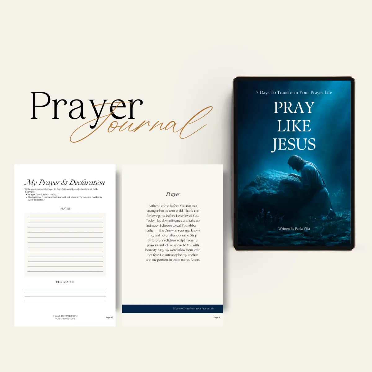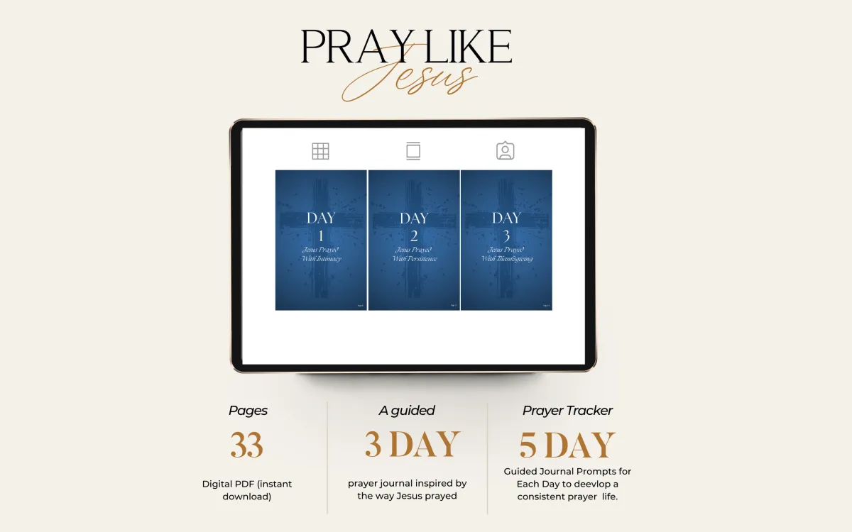 Pray Like Jesus is a guided prayer journal designed to help you slow down, reflect deeply, and learn how Jesus Himself prayed. Through Scripture, silence, journaling, and personal prayer, this journal invites you into a more intentional and intimate prayer life.